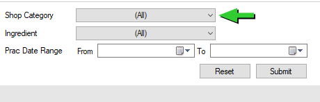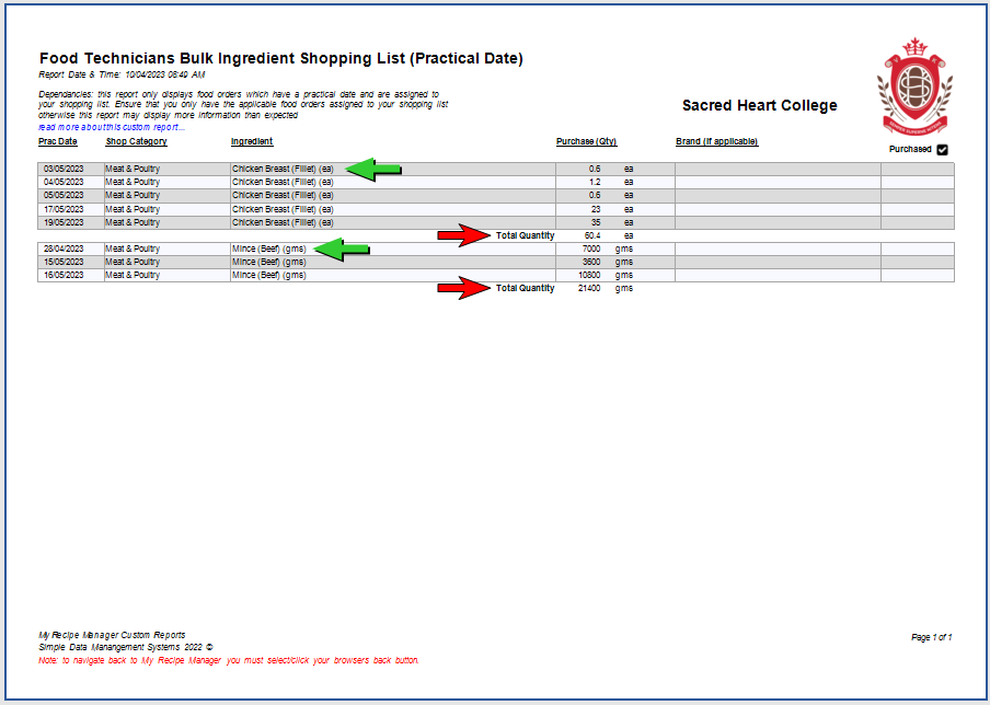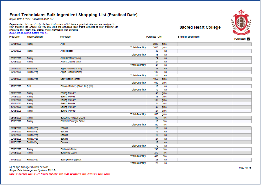 This custom report has been added to assist schools in producing a shopping list which can be filtered by shop category, ingredient name and practical date. This custom report was requested by Sacred Heart College (WA) who purchase certain ingredients in bulk for a specific period i.e. prac dates over a number of weeks or for a complete term.