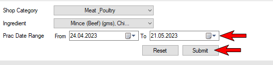 Once you have entered a 'Prac Date Range' select the submit button. This will refresh the report and display the shopping list for the selected ingredients (refer to below image).
