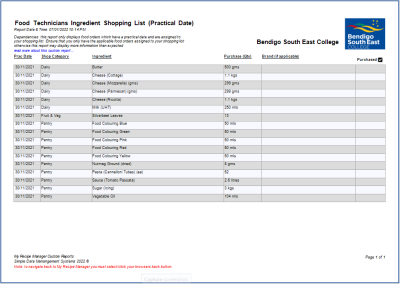This custom report has been added to assist schools in producing a shopping list which can be filtered by practical date and/or shop category. The report includes the below information: